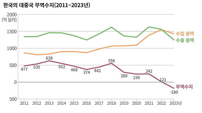 이강국 일본 리쓰메이칸 대학 교수는 최근 학술지 〈일본 정치경제〉에 기고한 논문 ‘글로벌 경제의 변동에서 한국의 경제성장과 성장 모델’에서, 중국 경제의 한국 의존도가 계속 낮아지는 추세를 지적했다. “한국의 대중 수출은 2018년의 1621억 달러에서 2019년 1362억 달러로 줄었다. 이 같은 감소 중 82%는 대(對)중국 중간재 수출(특히 정보통신 기술 부문) 실적이 하락했기 때문이다.” 무역협회에 따르면, 한국의 수출에서 중국이 차지하는 비중은 2005년에 20%를 넘긴 뒤 2018년 26.8%로 절정에 달했으나 지난해는 19.7%로 떨어졌다. 심지어 한국의 중국산 중간재 수입이 오히려 늘어나고 있다. 대중 무역수지 추이에서 드러난다(〈그림〉 참조). 한국은행의 무역수지(통관 기준) 추계에 따르면, 한국의 대중 무역흑자는 2013년 628억 달러가 정점이었고, 코로나19 팬데믹 이전인 2019년에 289억 달러, 2022년엔 12억 달러로 급락했다. 지난해 한국의 대중 무역수지는 180억 달러 적자다.