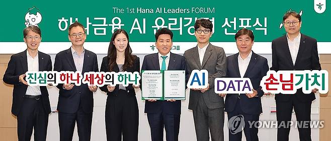 (서울=연합뉴스) 함영주 하나금융그룹 회장(왼쪽 네 번째)이 지난 26일 서울 중구 하나금융그룹 명동 사옥에서 그룹 임직원들과 하나금융 AI 윤리강령을 선포하며 기념 촬영하고 있다. 2024.3.27 [하나금융지주 제공. 재판매 및 DB 금지]