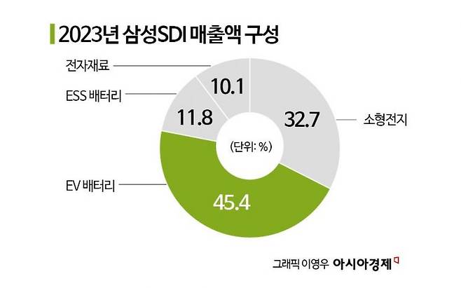 ◇지난해 글로벌 전기차 수요 둔화에 주가 곤두박질= 삼성SDI는 이차전지 전문기업이다. 소·중·대형전지 등 리튬이온 이차전지를 생산·판매하는 에너지솔루션 사업 부문과 반도체 및 디스플레이 소재 등을 생산·판매하는 전자재료 사업 부문을 영위하고 있다. 지난해 실적 기준 전체 매출액에서 에너지솔루션 부문이 차지하는 비중은 90%에 달한다.
