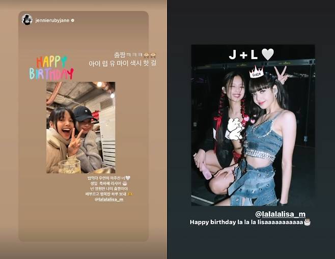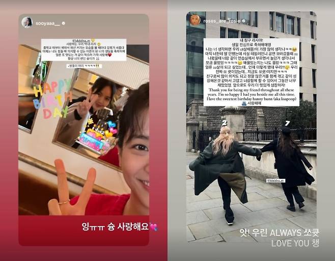 비슷한 시간대에 축하를 전한 멤버는 로제였다. 로제는 "내 칭구 리사야! 생일 진심으로 축하해애앵"이라고 시작되는 장문의 글과 사진을 올렸다.