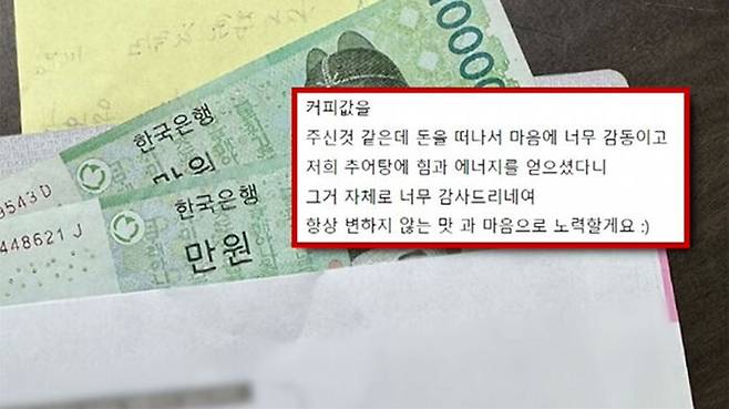 글쓴이는 "너무 감사드린다"며, 커피값을 주신 것 같은데 돈을 떠나서 마음이 너무 감동을 주었다고 전했습니다.