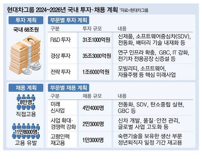 현대차그룹이 3년간 국내에서 8만명을 고용하고, 68조원을 투자하겠다는 계획의 절반 이상은 미래 모빌리티 사업을 포함한 완성차 부문이 차지하고 있다. 전동화, 소프트웨어중심차(SDV) 전환, 탄소중립 실현 등 미래 신사업 분야에서 3년간 4만4000명을 채용한다는 계획이다.