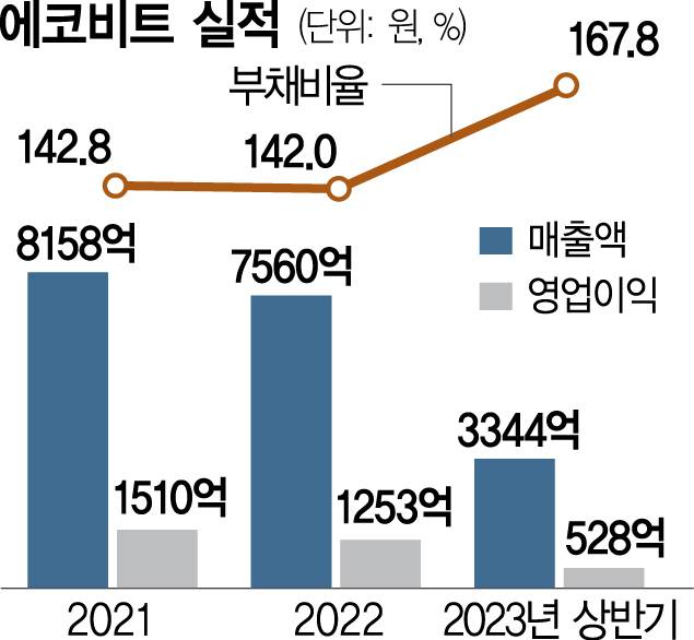 에코비트 실적은 다소 주춤한 상태다. 2022년 매출 7560억 원, 영업이익 1253억 원에서 지난해에는 상반기 기준 매출 3344억 원, 영업이익 528억 원을 기록했다. 차입금이 늘어 부채비율도 2020년 107.8%에서 지난해 상반기 167.8%로 높아졌다.