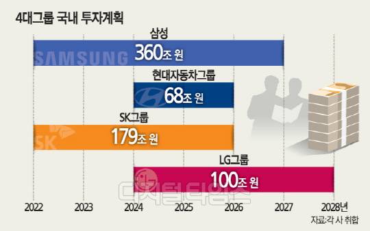 삼성의 경우 지난 2022년 5년간 투자하기로 한 450조원 중 80%(360조원)을 국내에 투입하기로 했다. 삼성전자는 팹리스 시스템반도체, 파운드리(반도제 위탁생산), 바이오 등 미래 먹거리와 신성장 IT(정보기술) 분야에 집중 투자해 일자리 창출과 대·중소기업간 동반성장 생태계 추진 의지를 내비쳤다.