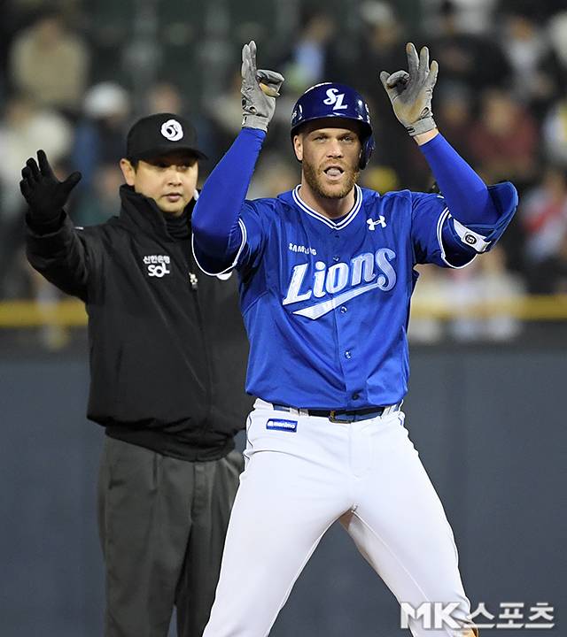 5회초 2사 1,2루에서 삼성 맥키넌이 적시타를 날린 뒤 기뻐하고 있다.