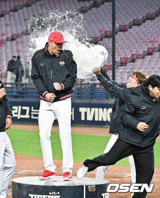 경기종료 후 데뷔 첫승 거둔 KIA 네일이 양현종에게 축하 물세례를 받고 있다. 2024.03.27 / soul1014@osen.co.kr