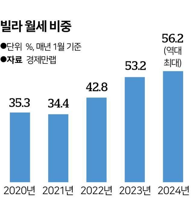 지난해 수도권에서 체결된 비아파트(다가구·연립 등) 임대차 계약의 67.2%가 월세(부동산R114 분석)였다. 이처럼 빌라 임대차시장에서 월세 비중이 급증하고 있는 현상은 여러 통계에서 확인된다.