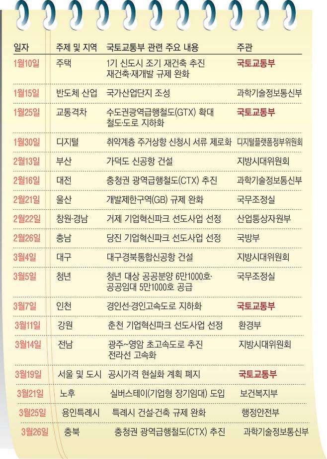 국토부가 직접 주관하지 않더라도 다른 부처가 담당하는 민생토론회에 참여한 경우도 14번이었다. 예컨대 비수도권에서 처음으로 열린 부산 민생토론회(11번째·2월13일)에서는 가덕도신공항 건설이, 울산에서 열린 토론회(13번째·2월21일)에서는 개발제한구역(GB) 규제 완화가 각각 언급됐다.