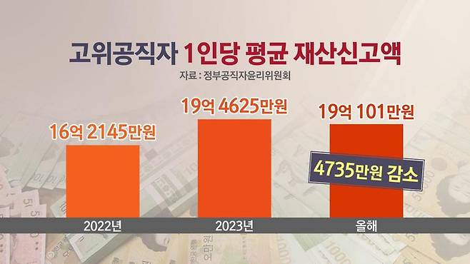 정부공직자윤리위원회에 따르면 고위공직자 1명당 평균 신고액은 19억 101만 원으로, 1년 전보다 4천700만 원가량 줄었습니다.
