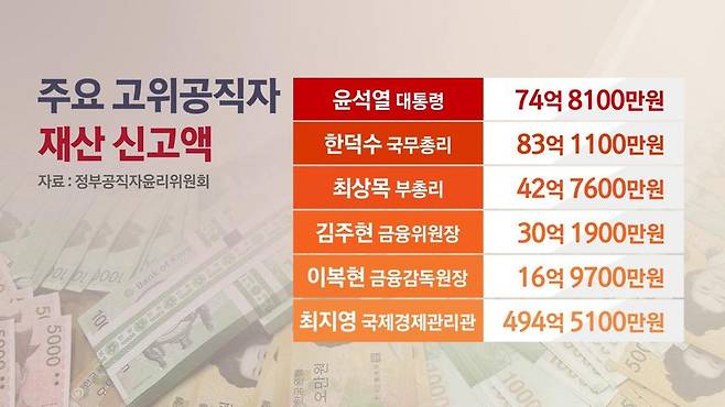 김주현 금융위원장은 30억 2천만 원을, 이복현 금감원장은 16억 9천만 원을 신고하면서 작년보다 소폭 감소했습니다.