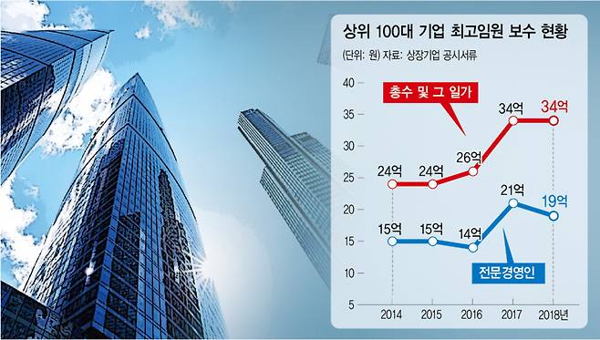 이들은 돈을 많이 받는다. 아니 상당히 많다. 절대적 기준에서 이들의 보수는 근로소득 기준으로 상위 0.1% 이상이다. 임원들끼리만 놓고 비교해도 높다. 2014∼2018년 동안 우리나라 상위 100대 상장기업 중에서 가장 많은 보수를 받는 임원의 평균 급여를 계산해 봤다. 이들의 보수조차 그가 총수 일가의 구성원인지 아니면 전문경영인인지에 따라 차이가 매우 컸다. 전문경영인은 연평균 약 17억원을 받았지만, 재벌 총수(혹은 그 일가)는 약 28억원을 받았다. 평균적으로 65%나 더 많다. 다시 말해 특정 ‘성씨’를 갖고 있으면 더 높은 보수를 받는다. 나는 이것을 ‘핏줄 프리미엄’이라고 부른다.