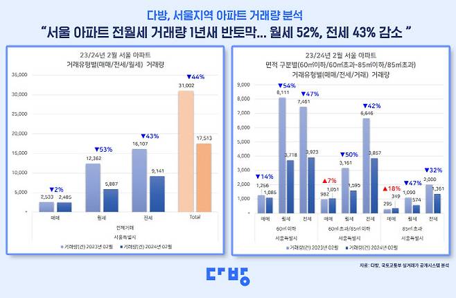 장준혁 다방 마케팅실 실장은 “부동산 시장 한파로 서울 지역 아파트 거래절벽이 이어지며 매매 시장보다 전월세 시장이 큰 타격을 입은 것으로 나타났다”라며 “특히 이번 분석 결과 주택 거래 침체 상황에서 상대적으로 소형 아파트가 더 크게 영향을 받은 것으로 보인다”라고 말했다.