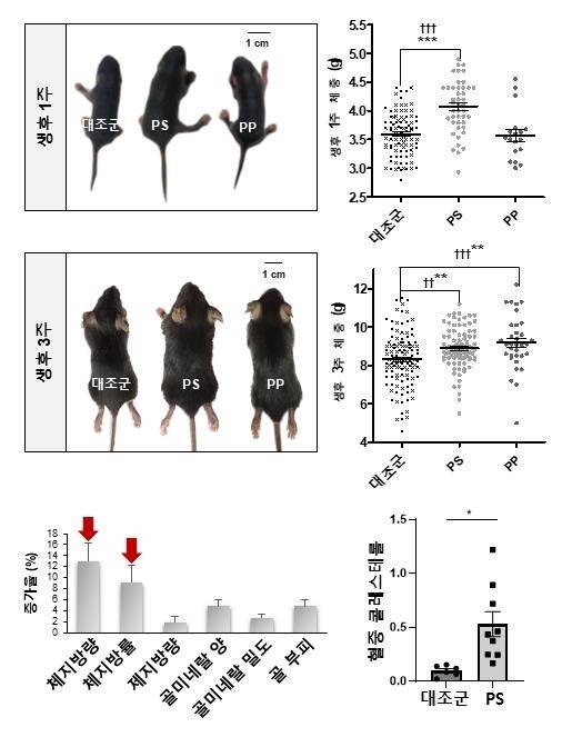 연구팀은 "폴리스타이렌(PS, polystyene)과 폴리프로필렌(PP, polypropylene) 초미세플라스틱에 노출된 모체의 자손이 성장호르몬의 분비량이나 섭취량의 증가가 없음에도 몸무게와 체지방이 두드러지게 증가함을 관찰했다"면서 "모체의 모유를 분석한 결과, 비만도와 관련이 높은 지질 성분인 LPC(리소포스파티딜콜린, lysophosphatidylcholine)는 증가하고 PC(포스파티딜콜린, phosphatidylcholine)는 감소해있었으며, 모유를 섭취한 자손의 혈액에서도 이와 유사한 변화를 확인할 수 있었다"고 설명했다.