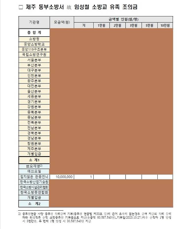 작성자는 "작년 12월 1일 제주에서 고 임성철 소방장이 순직한 사고가 있었다. 이후 많은 국민 여러분이 함께 애도해주셨다"며 "오늘 순직자 유족 지원 결과 문서를 봤다. 각 시도별 동료분들도 많은 기부를 해주셨고 여러 단체와 개인, 기업에서도 기부를 해주셨다"고 이야기했다.