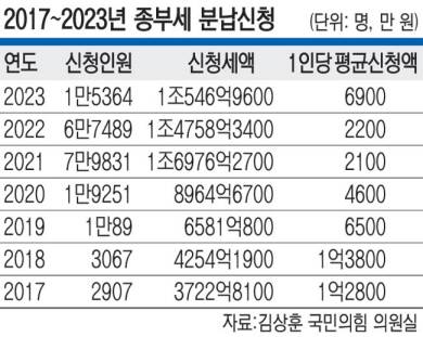 지난해 종부세 분담을 신청한 납세자가 2022년 대비 4분의 1로 줄고, 1인당 평균 분납액은 3배 이상 늘어난 것으로 드러났다.