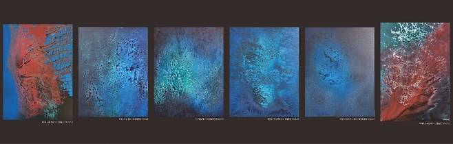 화엄법계도에서 자그마한 동자승이 거대한 화엄세계를 이루었듯이, 겁외풍경에서는 붓으로 물감을 흘려서 떨어뜨린 물방울 하나하나가 춤을 추면서 신비한 우주의 ‘생명’을 노래합니다. 푸르스름하고, 불그스름한 고색창연한 빛이 환상적인 오로라처럼 캔버스에 펼쳐지네요. 열정적이고 신비한 우주 법계를 표현한 다양한 색감에서는 통쾌한 자유로움이 느껴집니다.