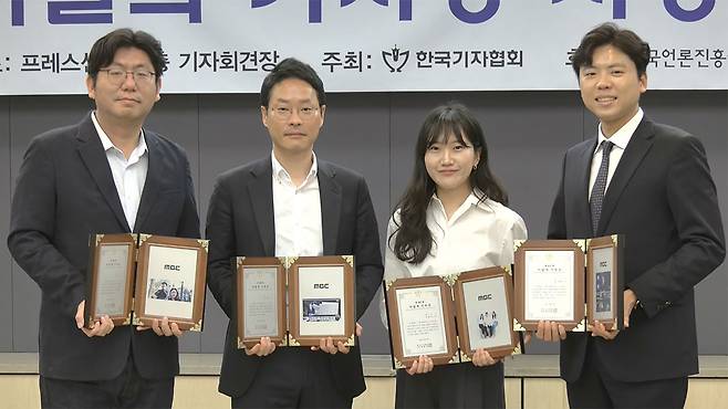 한국기자협회는 오늘(28일) 한국프레스센터에서 시상식을 열고, '쿠팡 블랙리스트 16,450명'을 취재 보도한 MBC 경제팀 차주혁, 조의명, 김건휘, 정혜인 기자에게 제402회 '이달의 기자상'을 수여했습니다.