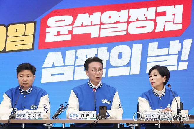 | ▲ 김민석 더불어민주당 총선 상황실장이 26일 오전 서울 여의도 중앙당사에서 열린 선대위 본부장단회의에서 판세 분석에 관한 기자 질문에 답하고 있다. |