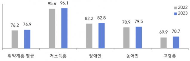 디지털 정보격차 실태조사 결과 2023년 취약계층의 디지털 정보화 수준은 76.9%로 전년 대비 0.7% 포인트 상승했다. 최근 5년 연속 상승 추세다.