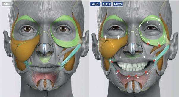 얼굴의 해부학적인 요인도 이런 현상을 일부 설명할 수 있습니다. 웃을 때 중요하게 작용하는 근육은 큰 광대근(Zygomaticus major, 아래 그림의 민트색)입니다.