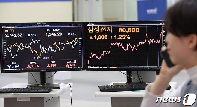 (서울=뉴스1) 이승배 기자 = 28일 서울 여의도 한국거래소에 삼성전자의 종가가 표시돼 있다.