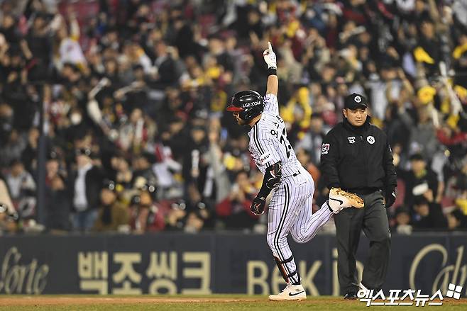 (엑스포츠뉴스 잠실, 박지영 기자) 28일 오후 서울 송파구 잠실야구장에서 열린 '2024 신한 SOL Bank KBO리그' 삼성 라이온즈와 LG 트윈스의 경기, 3회말 2사 2루 LG 오스틴이 삼성 선발투수 이승민 상대로 투런 홈런을 때려내고 있다.