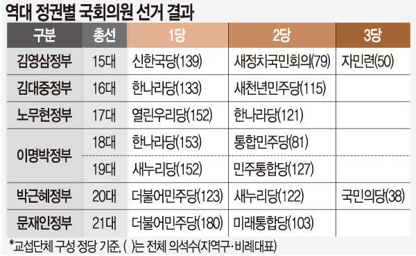 ‘총선 투표율이 60%를 넘으면 야당에 유리하다’는 속설도 맞지 않았다. 1987년 직선제 이후 실시된 9차례 총선 중 투표율 60%를 넘었던 5차례(13·14·15·17·21대) 선거에서 모두 여당이 1당을 차지했다. 높은 투표율은 꼭 야당 승리로 이어지진 않았다.
