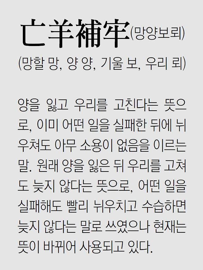 [신문과 놀자!/풀어쓰는 한자성어]亡羊補牢(망양보뢰)(망할 망, 양 양, 기울 보, 우리 뢰)