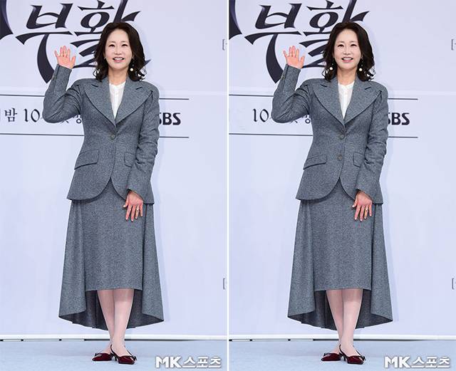 신은경은 이날 제작발표회에서 클래식한 스타일의 회색 재킷에 A라인 비대칭 롱스커트를 착용해 깔끔한 셋업 패션을 연출했습니다.