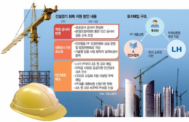 우선 LH는 유동성 확보가 필요한 건설사의 보유 토지를 3조 원 규모로 매입한다. 토지 매도를 희망하는 기업들로부터 매각 희망 가격을 제출받은 뒤 희망 가격이 낮은 순서대로 토지를 매입하는 ‘역경매’ 방식으로 진행된다. 대신 기업은 토지 매각 대금 전액을 부채 상환에 사용해야 한다. 앞서 LH는 1997년 외환위기와 2008년 글로벌 금융위기 당시에 두 차례 걸쳐 총 3조 3200억 원 규모의 부실 PF 부지 매입에 나선 바 있다.