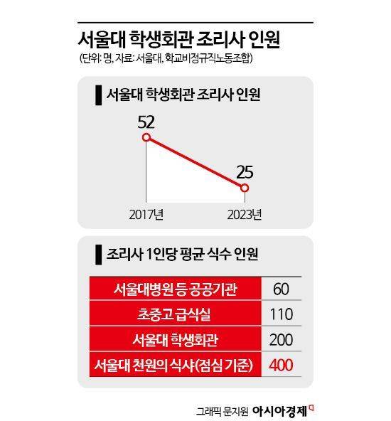 이에 따라 조리사 1인당 평균 식수 인원은 증가했다. 지난해 서울대 '천원의 식샤(점심)' 코너에서 근무하는 조리사의 1인당 식수 인원은 400명으로 조사됐다. 이는 서울대병원 등 공공기관(60명)의 6배, 초중고 급식실(110명)의 3배 수준이다. 서울대 학생회관(200명)과 비교해도 2배 많은 수치다.
