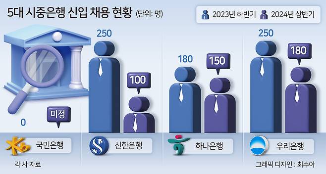 주요 은행들은 비대면 영업 확대에 따른 점포 축소 등 경영 효율화 지침이 이어지는 가운데, 지난해와 같은 대규모 채용 규모를 유지하기는 어렵다는 입장이다. 실제 5대 은행의 지난해 말 기준 점포 수(출장소 포함)는 2818개로 4년 전인 2019년 말(2117개)과 비교해 20.1%(701개)가량 줄었다. 매년 150개 이상의 영업점이 문을 닫고 있는 셈이다.
