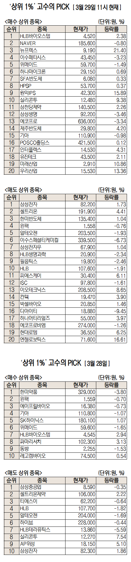 이날 미래에셋증권에 따르면 미래에셋증권 주식 거래 고객 중 최근 1개월 간 투자수익률 상위 1%에 해당하는 '주식 초고수'들이 오전 11시까지 가장 많이 사들인 종목은 HLB바이오스텝으로 집계됐다.