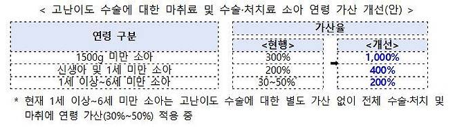 그간 고난이도 수술 시 연령 가산은 체중 1500g 미만 신생아와 1세 미만 소아에 대해서만 별도로 높게 적용됐는데, 6세 미만 소아에게도 높은 수준의 가산율을 적용하겠다는 것이다.