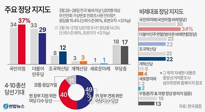 국민의미래 34% 민주연합 22% 조국혁신당 22%···비례 투표 의향[한국갤럽]