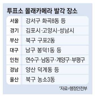 경남선관위와 양산시에 따르면 지난 18일 경남 양산시 한 행정복지센터 2층에서 출처를 알 수 없는 카메라가 발견된 후 이날까지 행정복지센터 총 6곳에서 불법카메라 6대를 찾아냈다. 사전투표소인 울산시 북구 농소3동 행정복지센터, 부산시 북구 구포2동 행정복지센터에서도 불법카메라가 발견돼 경찰이 수사에 착수했다.