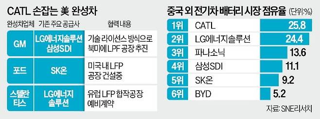 미국 양대 완성차 업체가 CATL과 손잡으면서 현지 시장을 장악해온 한국 업체에 비상등이 켜졌다. 현재 GM은 LG에너지솔루션·삼성SDI와, 포드는 SK온과 협력하고 있지만 한국 배터리사들은 2026년에나 전기차용 LFP 배터리 생산이 가능하다. 전기차 전문매체 일렉트렉은 “더욱 저렴하고 열 안정성이 높은 LFP 배터리 시장이 급성장했지만 한국·일본 업체들은 기회를 잡지 못했다”고 지적했다.