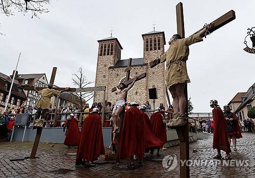 epa11249382 Actors dressed as Jesus Christ (C) and Roman soldiers re-enact the Stations of the Cross during the Good Friday Procession in Bensheim, Germany, 29 March 2024. Around 90 amateur actors in historical costumes parade through the center of Bensheim and re-enact crucifixion of Jesus Christ and the Stations of the Cross (Via Crucis). Christians of the Catholic and Western Christian churches around the world on 29 March 2024 observe Good Friday, the day when, according to the Bible, Jesus Christ was crucified by the Romans in Jerusalem. EPA/RONALD WITTEK