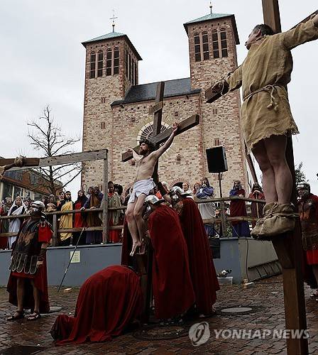 epa11249380 Actors dressed as Jesus Christ (C) and Roman soldiers re-enact the Stations of the Cross during the Good Friday Procession in Bensheim, Germany, 29 March 2024. Around 90 amateur actors in historical costumes parade through the center of Bensheim and re-enact crucifixion of Jesus Christ and the Stations of the Cross (Via Crucis). Christians of the Catholic and Western Christian churches around the world on 29 March 2024 observe Good Friday, the day when, according to the Bible, Jesus Christ was crucified by the Romans in Jerusalem. EPA/RONALD WITTEK