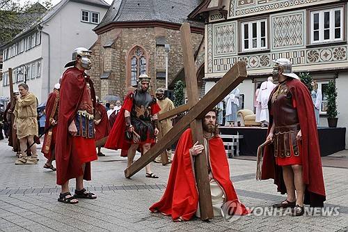 epa11249394 Actors dressed as Jesus Christ (C) and Roman soldiers re-enact the Stations of the Cross during the Good Friday Procession in Bensheim, Germany, 29 March 2024. Around 90 amateur actors in historical costumes parade through the center of Bensheim and re-enact crucifixion of Jesus Christ and the Stations of the Cross (Via Crucis). Christians of the Catholic and Western Christian churches around the world on 29 March 2024 observe Good Friday, the day when, according to the Bible, Jesus Christ was crucified by the Romans in Jerusalem. EPA/RONALD WITTEK