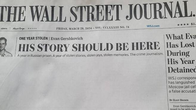 WSJ은 29일자 1면 지면의 머리기사 자리에 "게르시코비치의 기사가 여기에 있어야 한다"는 제목만 있는 공란 기사를 싣고 러시아의 게르시코비치 기자 장기 구금에 대해 '무언의 규탄'을 했습니다.