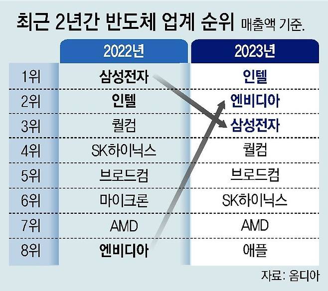 AI 구동에 필수적인 그래픽처리장치(GPU) 분야 세계 1위 업체인 엔비디아는 순위가 8위에서 2위로 뛰어올랐다. 지난해 엔비디아 매출은 491억6100만 달러로 전년 대비 133.6% 급등했다. 옴디아는 “반도체 침체에도 불구하고 AI는 중요한 성장동력으로 떠올랐다. 엔비디아는 이 시장에서 명백한 승리자”라고 평가했다.