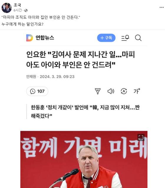 이에 대해 조국혁신당 조국 대표가 즉각 비판적인 반응을 보였다. 조 대표는 자신의 SNS에 관련 기사를 인용하며 “마피아 조직도 아이와 집안 부인은 안 건든다, 누구에게 하는 말이냐”고 적었다.