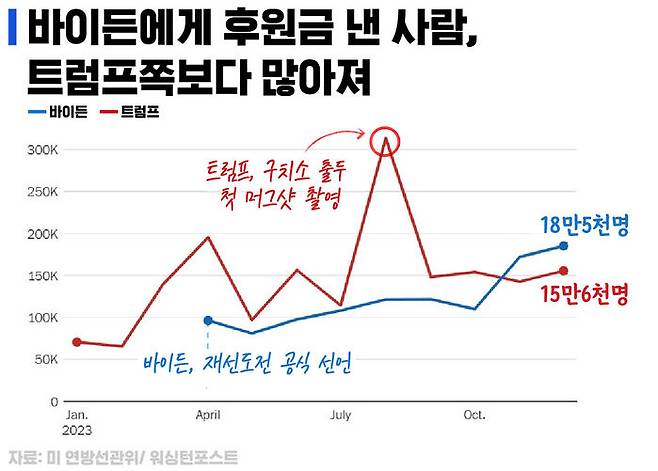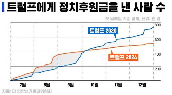 워싱턴포스트에 따르면, 트럼프는 모금 액수 총액뿐 아니라 후원금을 내는 사람의 숫자에서도 바이든에게 지난해 11월부터 역전당했다.