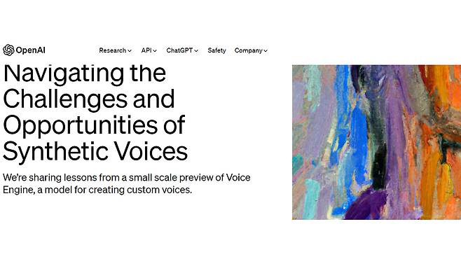 오픈AI는 현지 시간 29일 자사 블로그에 '인조(Synthetic) 음성의 도전과 기회 탐색'하기란 제목으로 자사가 개발한 보이스 엔진의 사전 실험 결과를 공개했습니다.