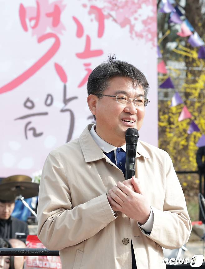 (서울=뉴스1) 권현진 기자 = 오승록 노원구청장이 30일 오후 서울 노원구 한국성서대학교 옆 당현천 바닥분수 일원에서 열린 ‘2024년 당현천 벚꽃음악회’에서 축사를 하고 있다.