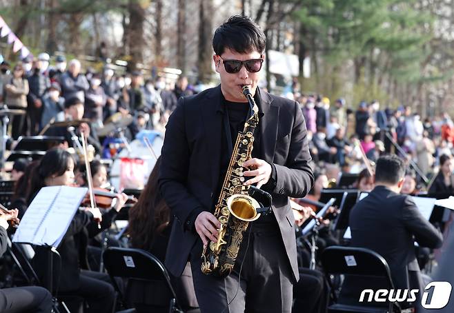 (서울=뉴스1) 권현진 기자 = 김성훈 색소폰 연주자가 30일 오후 서울 노원구 한국성서대학교 옆 당현천 바닥분수 일원에서 열린 ‘2024년 당현천 벚꽃음악회’에서 화려한 무대를 선보이고 있다.