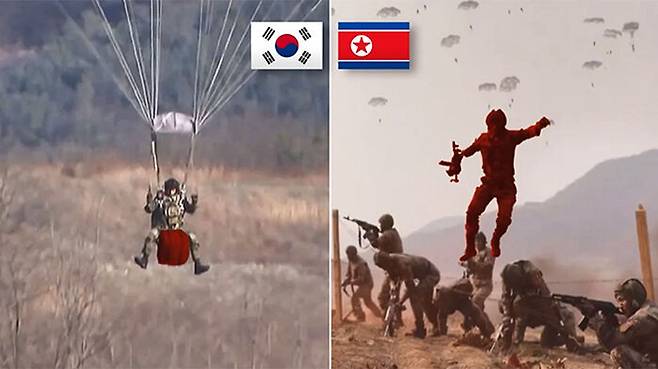 그런데, 적진 깊숙이 침투한 뒤 낙하산을 펴는 우리 공수부대원들과 달리 북한 공수부대원들의 경우 뛰어내리자마자 낙하산이 펴집니다.
