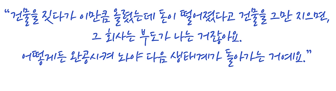 = 효율화를 유지하고 끊임없는 이노베이션(innovation)이 진행돼야 해요. 창업할 때 보면 처음에는 엄청난 효율을 갖고, 소수의 인력이 굉장히 큰 시간을 투입하는데, 소수의 인원이 움직이면 커뮤니케이션이 너무 쉽거든요, 한 사람이 굉장히 많은 일을 하고요. 그러니까 효율성을 갖고 이노베이션을 위해서 시간을 쓰는데, 회사가 한번 만들어져서 운영되면 비대해지고 빨리 대응하지 못하게 돼요. 한 가지 일을 여러 명이 하니까, 또 결정을 할 때 위원회를 만들어 진행을 하면서 효율은 계속 떨어지고요. 처음 시작할 때처럼 이노베이션을 하는 것도 좀 약해져 있고. 그러다 보니 계속 유지하지 못하는 것 같아요. 그래서 효율화를 유지하는 게 중요한데, 구글이나 애플 같은 조직도 보면 굉장히 비대한 회사지만, 점조직처럼 움직이면서 끊임없는 이노베이션을 하고 계속 새로운 프로젝트를 추구하게끔 만들죠. 그런 부분들이 상당히 중요한 것 같습니다.