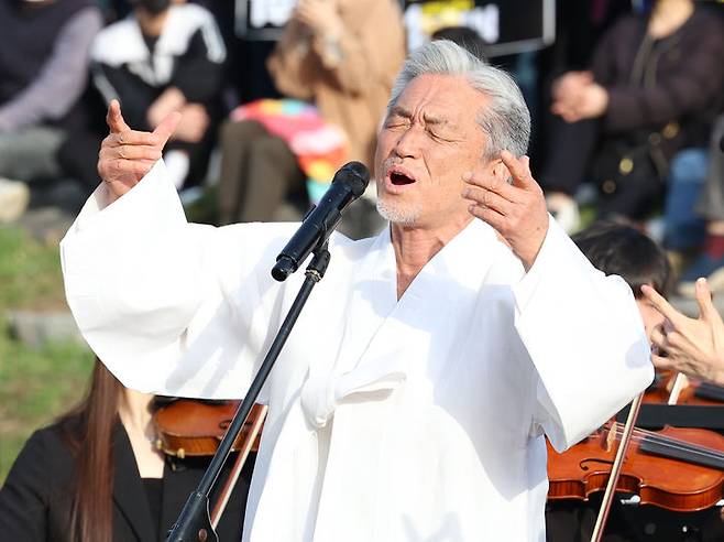 [서울=뉴시스] 조수정 기자 = 소리꾼 장사익이 30일 오후 서울 노원구 한국성서대학교 옆 당현천 바닥분수 일원에서 열린 ‘2024년 당현천 벚꽃음악회’에서 공연하고 있다. (사진=노원구 제공) 2024.03.31. photo@newsis.com *재판매 및 DB 금지